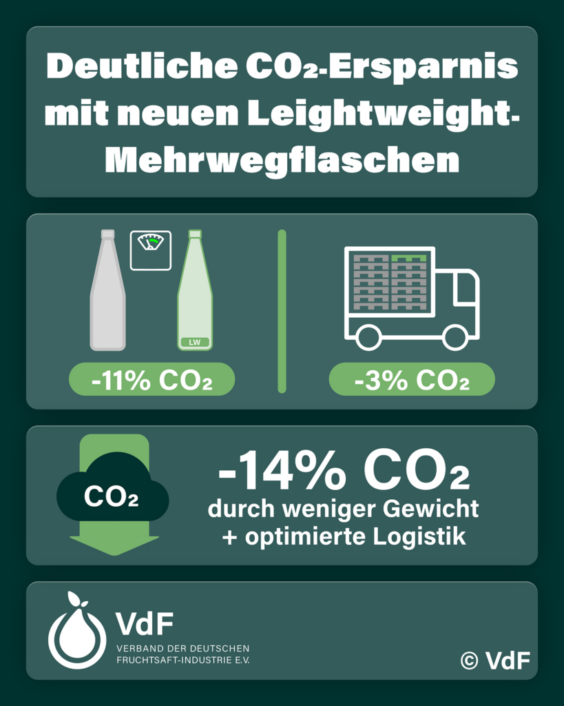 Die 0,7-Liter-Flasche wiegt künftig 400 statt 450 Gramm, die 1,0-Liter-Flasche 535 statt 600 Gramm. Das entspricht einer Gewichtsreduzierung und einer CO2-Ersparnis von jeweils rund elf Prozent pro Flasche. Rund 250 Millionen VdF-Mehrwegflaschen sind aktuell im Umlauf und werden schrittweise ersetzt. Die Vorteile der neuen Flaschen sind erheblich: Ein Standard-LKW kann nun 36 statt 35 Vollgutpaletten transportieren. Diese Umstellung senkt die transportbedingten CO2-Emissionen und Logistikkosten um etwa drei Prozent. Insgesamt wird durch die Einführung der neuen VdF-Mehrwegflaschen also 14 Prozent weniger CO2 freigesetzt.